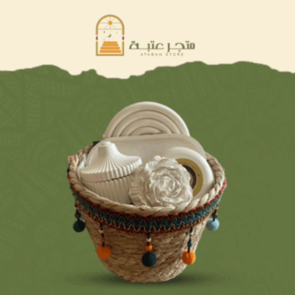 مبخرة مع علبة بخور ضمن سلة الهداية هي إضافة لا غنى عنها لكل منزل سعودي يحب الأصالة. سواء للاستخدام اليومي أو كهدية، ستضيف لمسة فخامة إلى أي مناسبة. اطلبها اليوم من عتبة ضمن قسم هدايا.